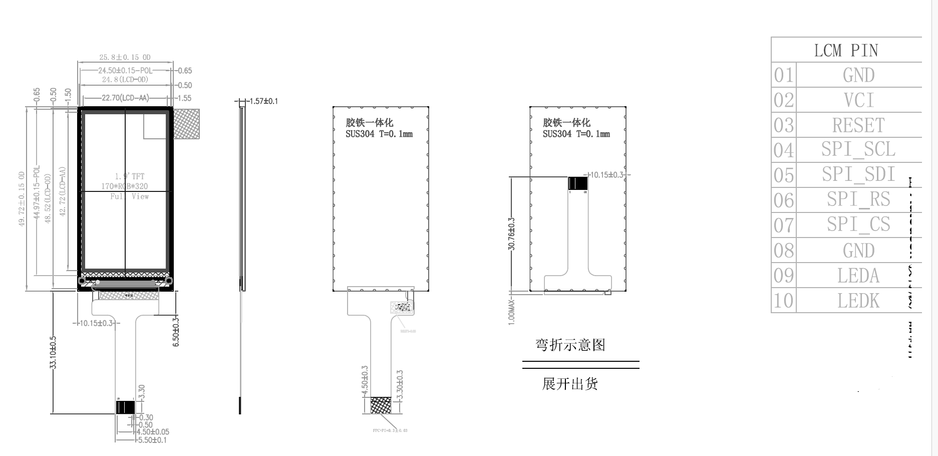 22.70*42.72The Model#FT-01903-B-N-A, is 1.9 inch TFT display with resolution of 170(RGB) * 320, in portrait mode. It is IPS TFT LCD, featured of full view angle and high contrast. The display module outline dimension is 25.8x49.72x1.57mm, and active area size of 22.70x42.72mm. This 1.9 inch TFT LCD display is built-in with driver IC ST7789V2 supporting 4-SPI interface connected by 10pin FPC.