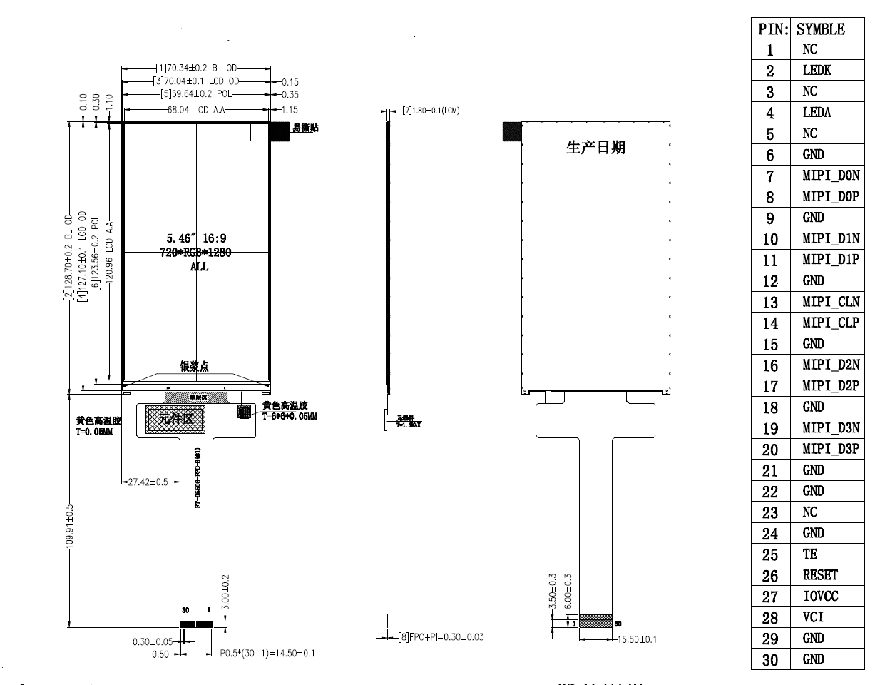 68.04*120.96The Model#FT-05506-B-N-B, this is a 5.0 inch HD TFT LCD with a resolution of 720*1280 (WXGA), featuring an aspect ratio of 9:16, portrait mode. It utilizes ADS technology, normally black, transmissive mode , to boast to be full-viewing angle of 80/80/80/80 degrees (Typ.), and high contrast of 1200:1. For the 5.5 inch portrait TFT LCD display, its Active Area size measures 68.04×120.96 mm (W× H), while LCD outline dimension is 70.04 × 127.10 mm (W× H), designed with narrow bezels. Incorporating the 0.20+0.20 mm ITO glass substrate combined with ultra-thin backlight, the 5.5 inch TFT LCD module has outer dimensions of 70.34×128.10 mm and a ultra-thin module thickness of only 1.80 mm. The driver IC for this 5.0 inch HD TFT LCD module is ILI9981C, with a 30PIN MIPI interface.